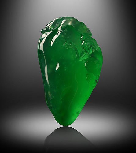 清 翡翠雕云蝠图寿字扳指 为冰种水地子撒绿翠料碾琢而成,翠色艳美,抛光明亮,包浆莹泽。外壁一面雕饰云蝠纹,流动飘逸,一面刻以团寿纹,寓意福从天降,福寿双全。纹饰皆为坨子工,水头和翠色上都堪称上乘,具有清中期典型特征
