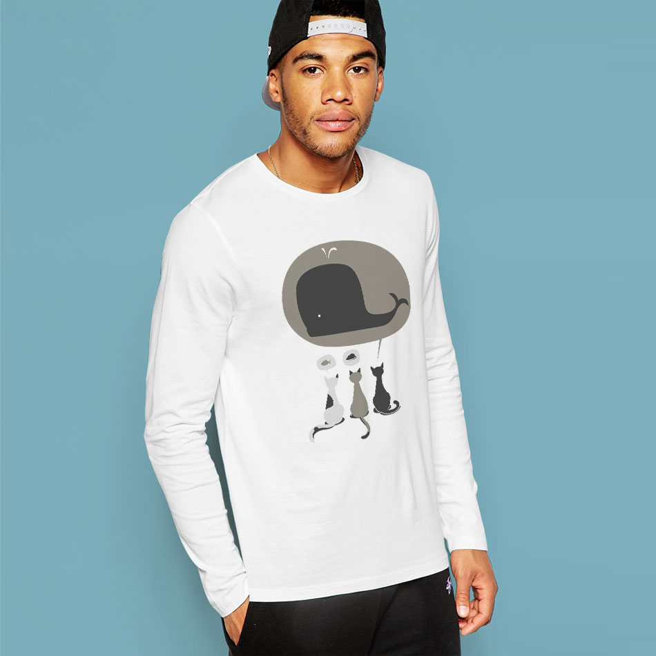 沭朴秋季男士青年学生潮纯棉圆领修身长袖t恤打底衫猫鱼印花