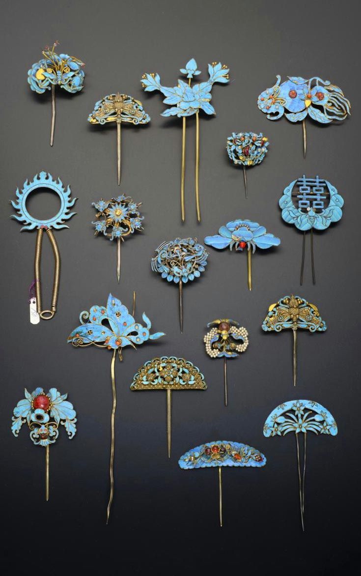 點翠|制作工藝極為繁雜,制作時先將金、銀片按花形制作成一個底托,再用金絲沿著圖案花形的邊緣焊個槽,在中間部分塗上適量的膠水,將翠鳥的羽毛巧妙地粘貼在金銀制成的金屬底托上,形成吉祥精美的圖案。這些圖案上一般還會鑲嵌珍珠、翡翠、紅珊瑚、瑪瑙等寶玉石,越發顯得典雅而高貴。