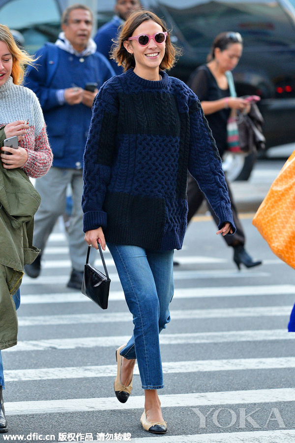 Alexa Chung——粗线针印花毛衣,搭配牛仔九分裤和Chanel双色芭蕾鞋,带着时尚随意感。