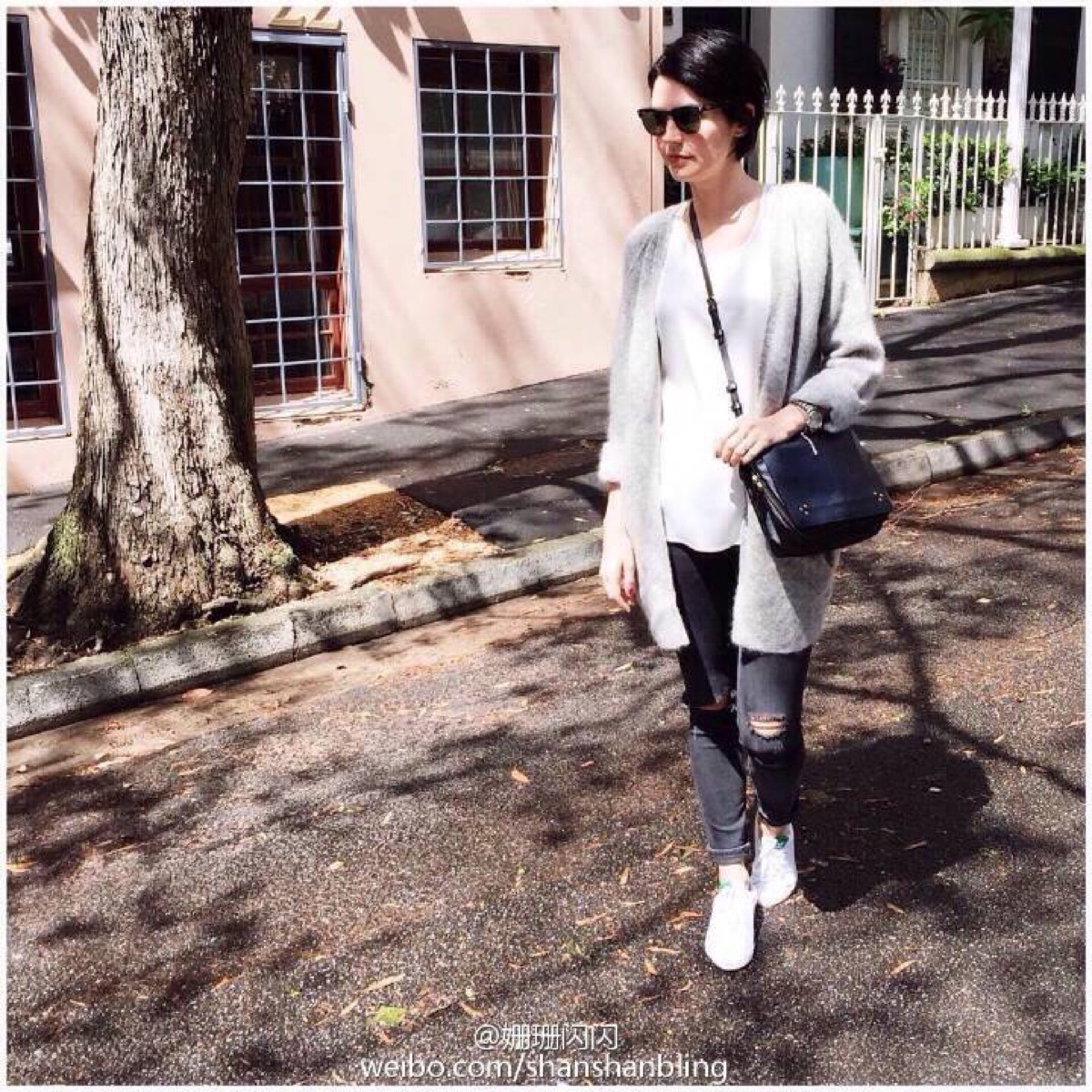 灰色开衫搭配黑色破洞牛仔裤
