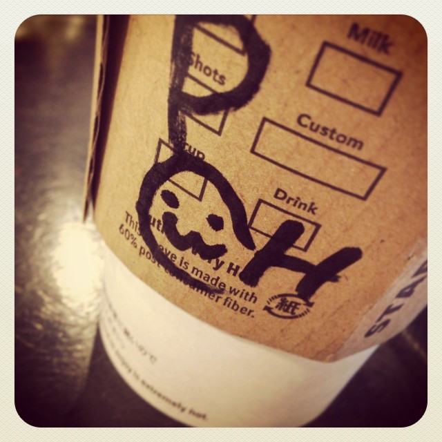 すたばの持ち帰り。にっこりしたサイン(☻←こういうの)はよく描いてもらうけど、これはオバケみたいで可愛いね。