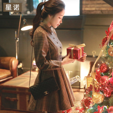 星诺正品2016秋冬季新款女装长袖复古文艺范百褶衬衫格子连衣裙厚