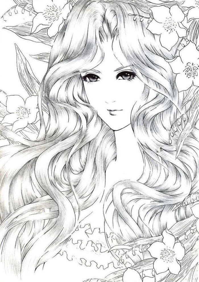 黑白稿 少女 花