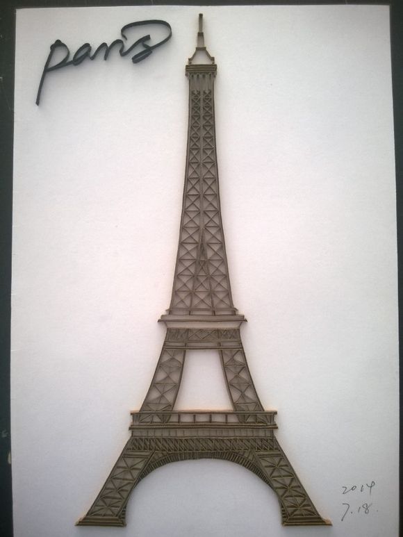 看过纸雕的埃菲尔,也看过立体衍纸埃菲尔,今天我也终于有了自己的平面线条衍纸埃菲尔!! 吧里好像还没见到过,所以应该算是原创吧~~呵呵~~(我这是A4的,里面叉叉叉的小纸条太多了,都快做疯了~~) 这是成品,随便找了个相框发现超搭,自己已经对这幅作品爱不释手了~~~ 这是成品侧面和底部的视角 这是还没加英文的埃菲尔的三个视图 纠结了半天要不要加英文,因为怕写的不好看,最终还是加上去了,不过加了之后确实有不一样的感觉! 最后再发一张线稿图吧,方便大家做