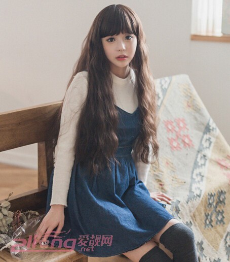 4、这款偏文静一些的及腰韩式蛋卷头长发,也很可爱呢,齐刘海搭配及腰长发,散发出女神般的气质,不管你是女汉子还是女神经,都能助你一秒变文静女神哦!