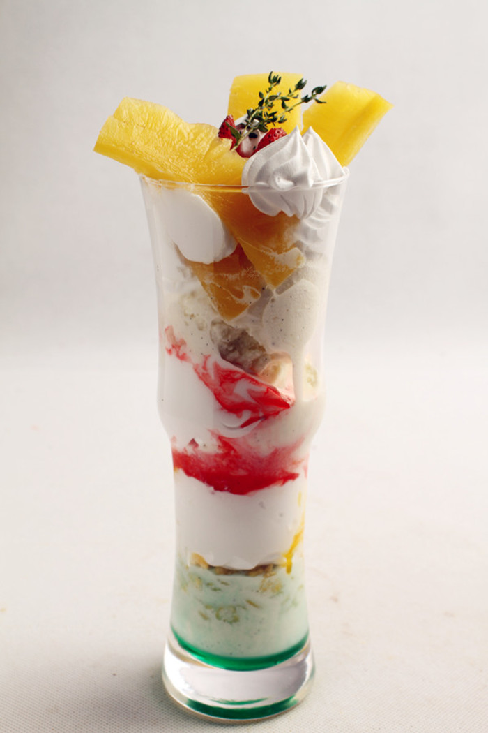 【凤梨百汇】材料: 薄荷糖浆10ml 石榴糖浆10ml 芒果浓缩汁10ml 菠萝片4片 草莓1个 玉米片适量 打发鲜奶油适量30克 香草冰淇淋球6个制作: 1、将薄荷糖浆倒入杯底,放上1个香草冰淇淋球,再撒上玉米片。2、挤上鲜奶油,接着倒上芒果汁,在上面放上2个冰淇淋球,再挤上鲜奶油。3、淋上石榴糖浆,在上面放上3个香草冰淇淋球,再挤上鲜奶油。4、最后放上菠萝片和草莓装饰,挤上鲜奶油即可。