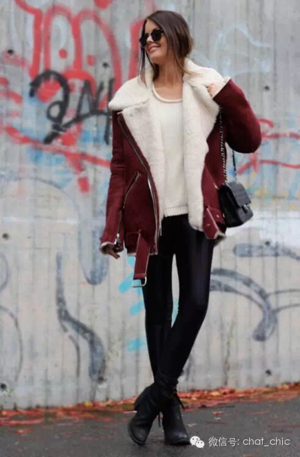 这种皮毛一体的款式,换上酒红色,是不是没那么乡村风了呢?建议还是黑白内搭,配着链条小包,让整体看起来轻盈得当。也是二十岁出头的MM们要多多考虑的风格哦。
