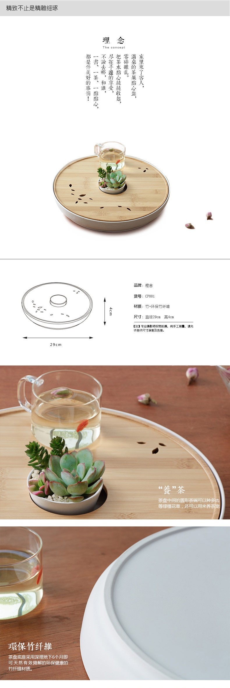 创意竹制小号干泡盘茶道功夫茶具圆形储水托盘茶台茶盘 橙舍