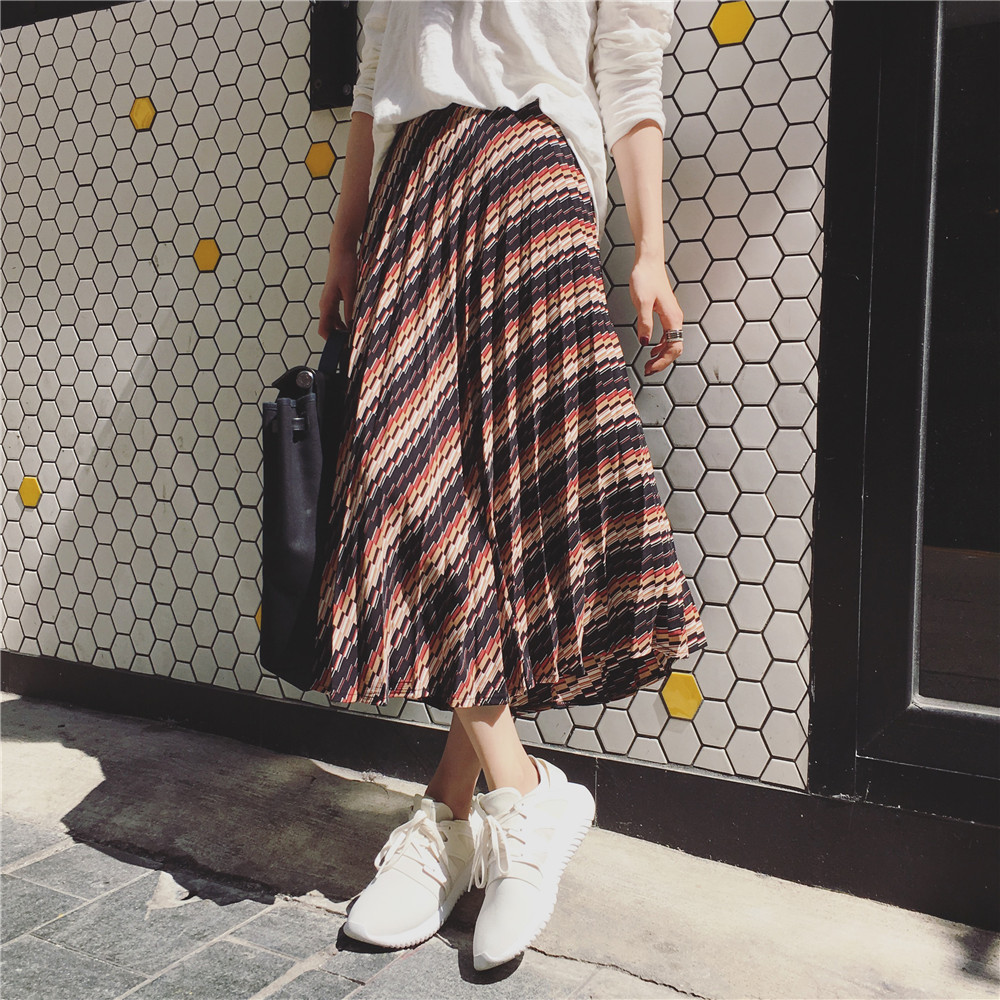 小绿2016SS 彩条百褶侧拉链半身雪纺长裙