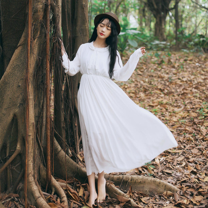 2016春装女装日系甜美显瘦白色打底长袖中长款宽松雪纺连衣裙