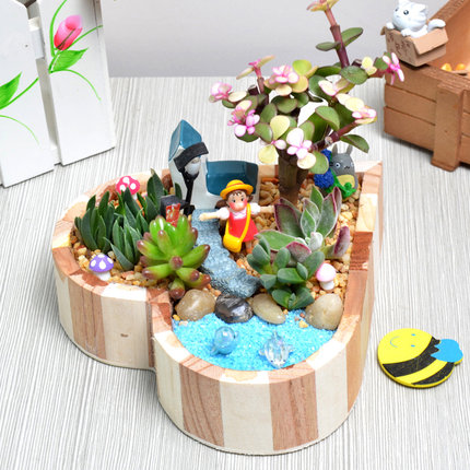 清新的金枝玉叶与众多肉肉的组合,别是一番景色,心形的木盒底盘,很有特色。
