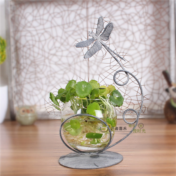 田园乡村铁艺家居摆件复古蜻蜓桌面摆设铜钱草水培器皿透明玻璃杯
