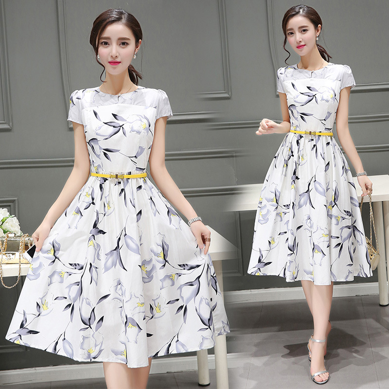 欧货女装2016新款夏季印花中长裙圆领短袖连衣裙打底修身A字裙女