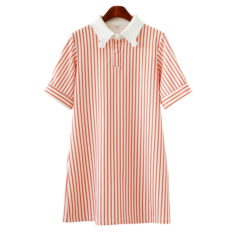 2016夏新品甜美小清新刺绣娃娃翻领学院风竖条纹短袖衬衫连衣裙女