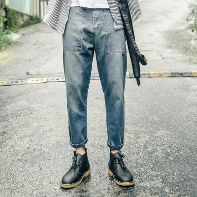 夏装新款原创设计款日系复古男士修身款牛仔裤小脚韩版哈伦九分裤