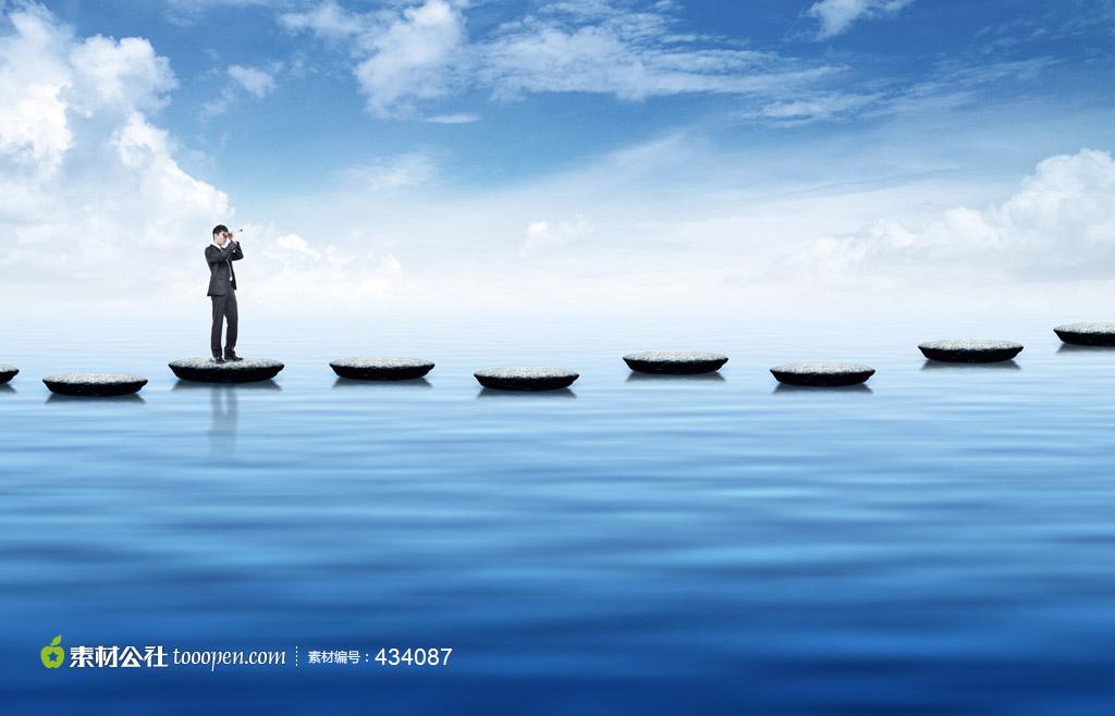 创意概念之在水面石子路上拿着望远镜的商务人士