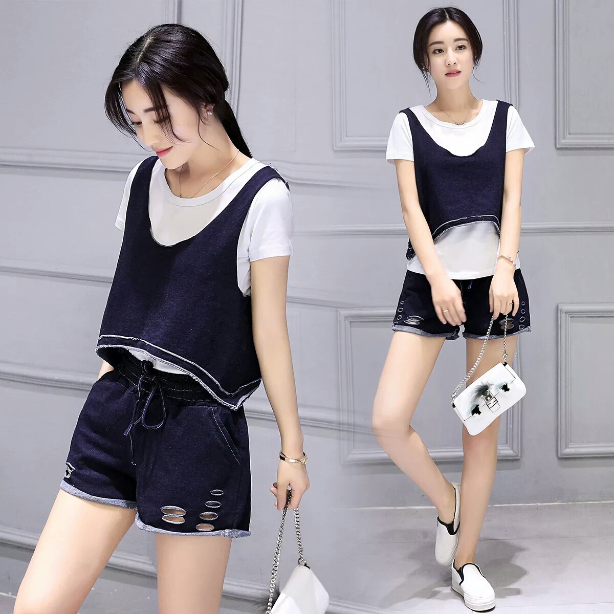破洞圆领短袖2016年夏季新款短款马甲三件套[杨兰家小铺]1694246