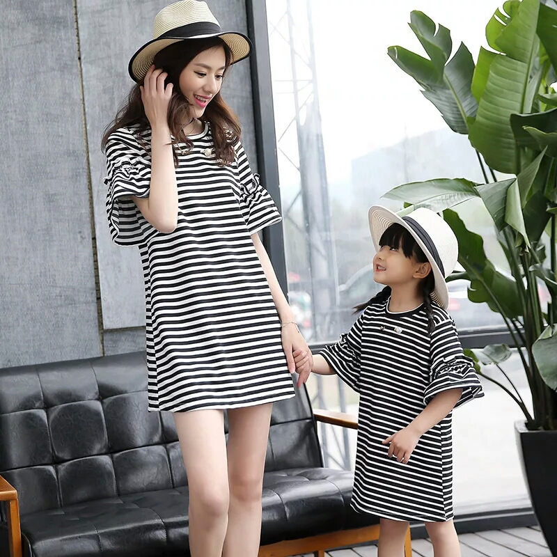 中长款条纹T恤亲子装母女装夏季新款女时尚圆领条纹短袖T恤[杨兰家小铺]1694246