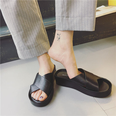 2016夏季新款中跟厚底真皮凉拖鞋女韩版时尚外穿松糕底防滑一字拖