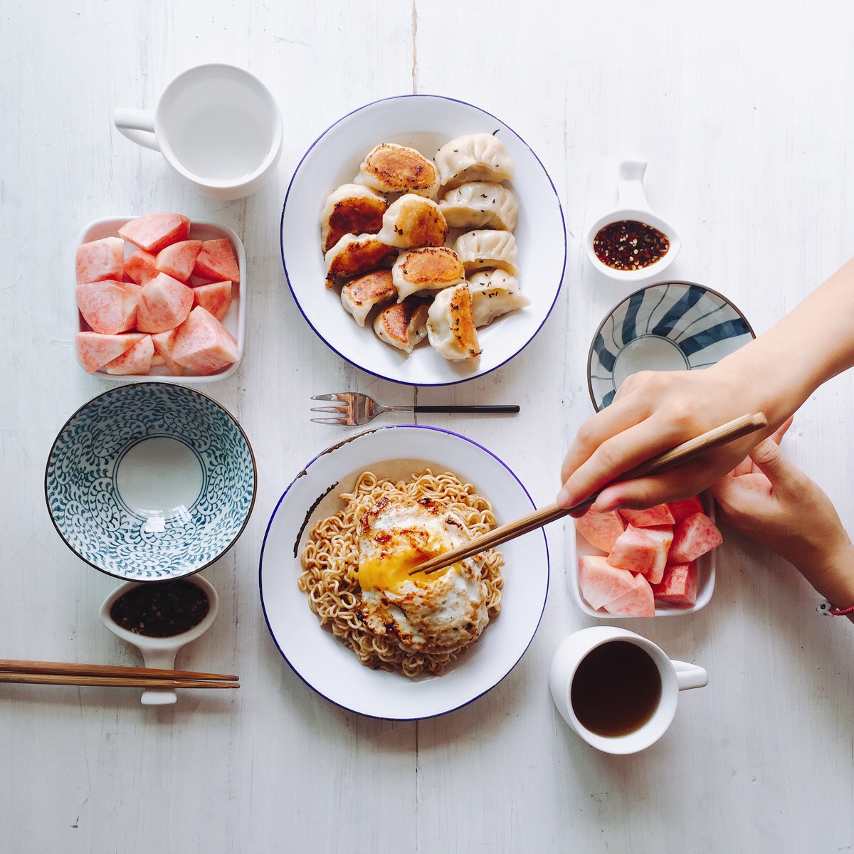早呐~今天早餐略多煎饺/炒面/荷包蛋/桃子吃的饱饱好开工~