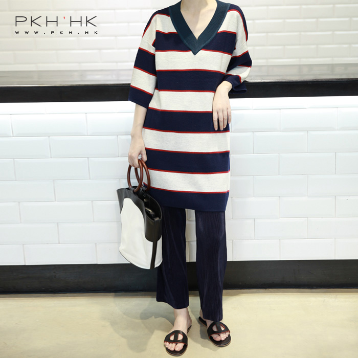PKH.HK上 秋 时髦超显气质肤色宽松V领针织条纹连衣裙