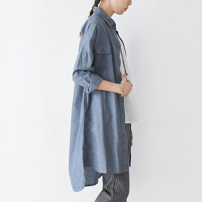 陈小麦高级定制~秋装超宽松棉麻文艺风落肩前短后长长袖大衬衫蓝