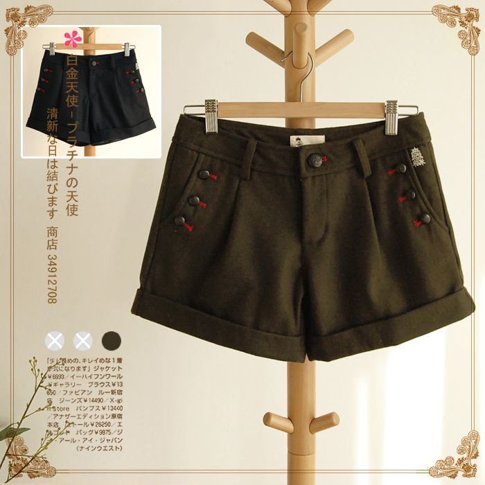 森女系复古英伦徽章扣纯色翻边毛呢短裤打底裤日系春装