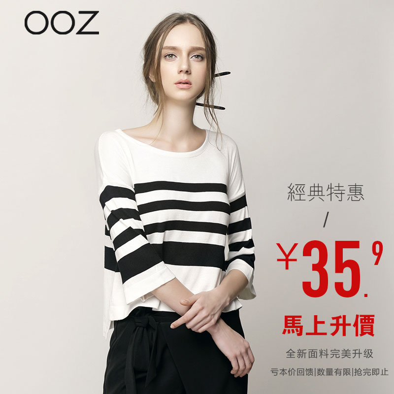2016新款初秋条纹针织衫套头女七分袖短款针织上衣打底宽松T恤衫