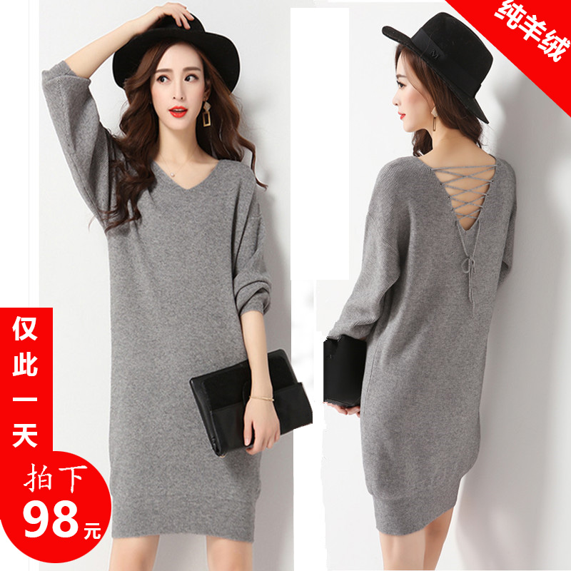【天天特价】秋冬中长款宽松大码V领套头毛衣女针织打底衫羊绒衫