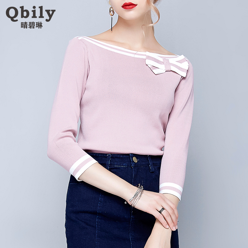 秋季毛衣一字领上衣女韩版喇叭袖七分袖条纹薄款套头针织衫打底衫