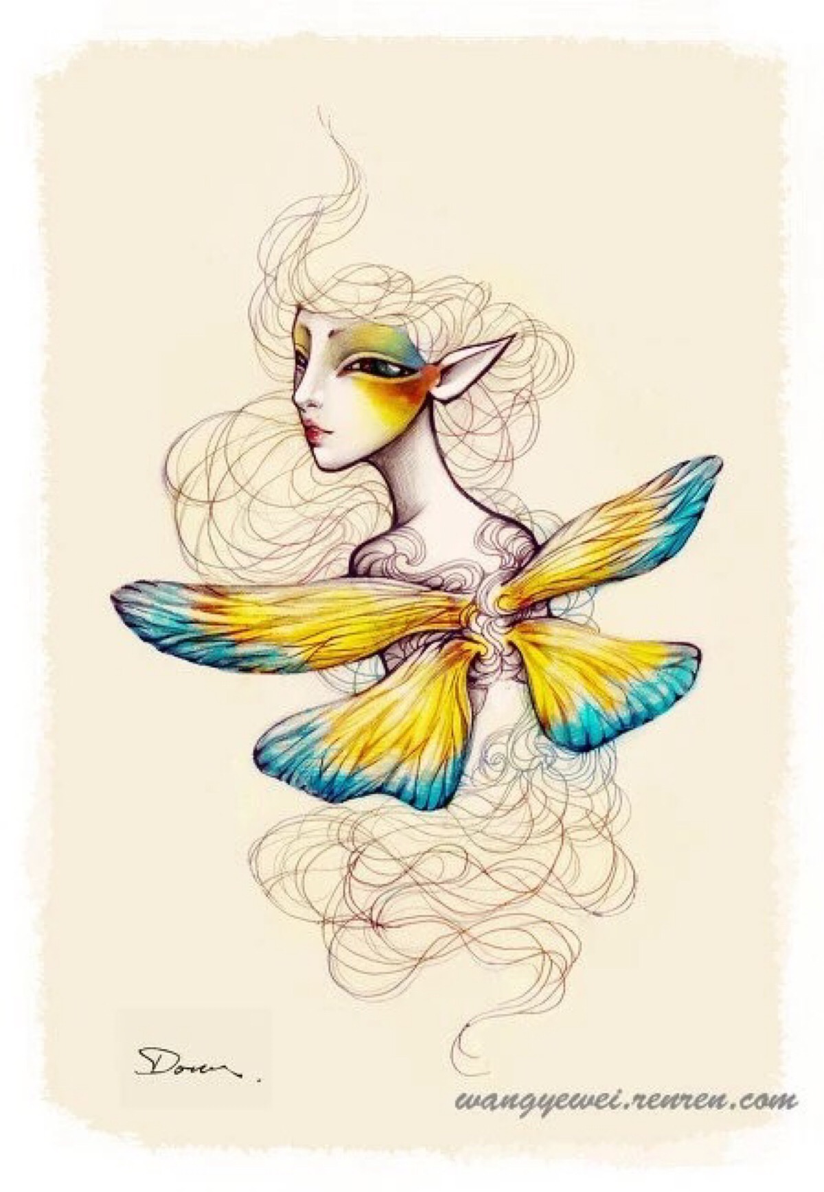 来自中国插画师Dou的插画,Dou惯用线条来表达整幅画,独特的构图用柔软的线条装饰没有表情的面具,圆润饱满的脸颊被流畅的温柔的线条包围,大大的双眼,那么忧郁无助,当中又透露出倔强。其中面具独特的妆容还有红红的腮红很有我国国粹京剧的特色。