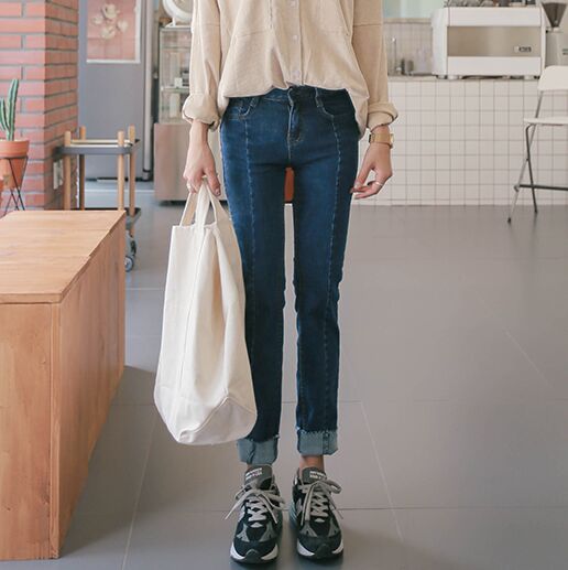 韩国 2016秋季女装 中线 翻边 牛仔裤 长裤 S29
