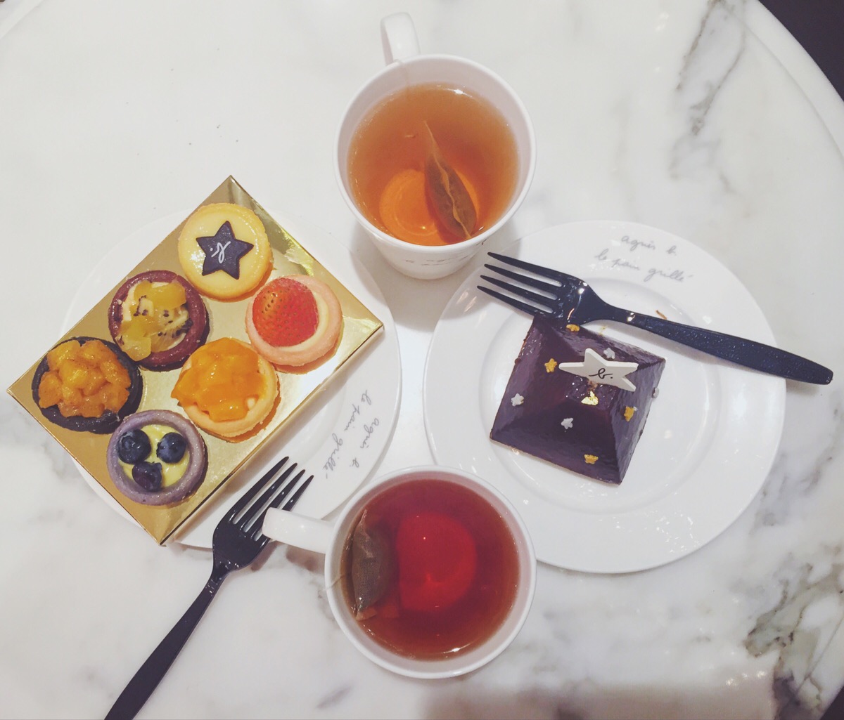 agnès b. Café LPG 香港沙田新城市广场,agnès b. 服装包包专柜旁边开的咖啡吧~甜点都很精致,遗憾没吃到雪糕。巧克力开心果蛋糕+水果塔+皇爵红茶+马可波罗果茶,都很赞!