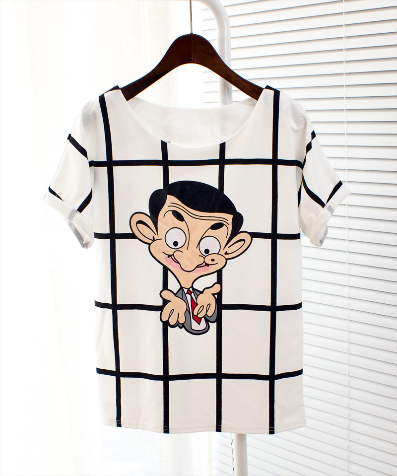 春装韩版童趣憨豆先生大格纹休闲宽松T恤女短袖