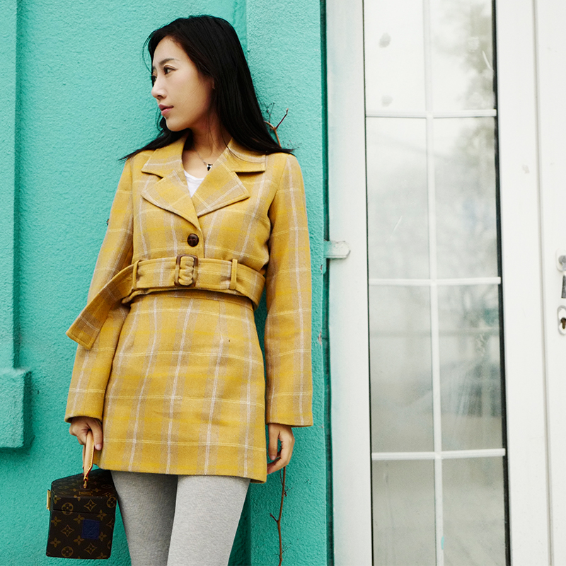BELLAWANG 英伦复古风潮黄色格子完美比例长腿立现秋冬羊毛呢套装