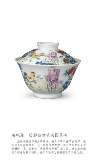 清乾隆,粉彩孩童喂鸡图盖碗。盖碗分碗盖与碗身两部分,碗身正面一童子在湖石、花卉间正给雄鸡喂食,几只雏鸡围绕左右。背面书写乾隆皇帝御制诗一首,底部有“大清乾隆年制”篆书款。碗盖上的图案与碗身的基本相同。童子与雏鸡为画面增添了天真之趣。