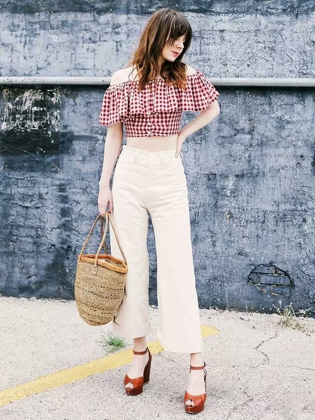 格子一字肩 阔腿裤