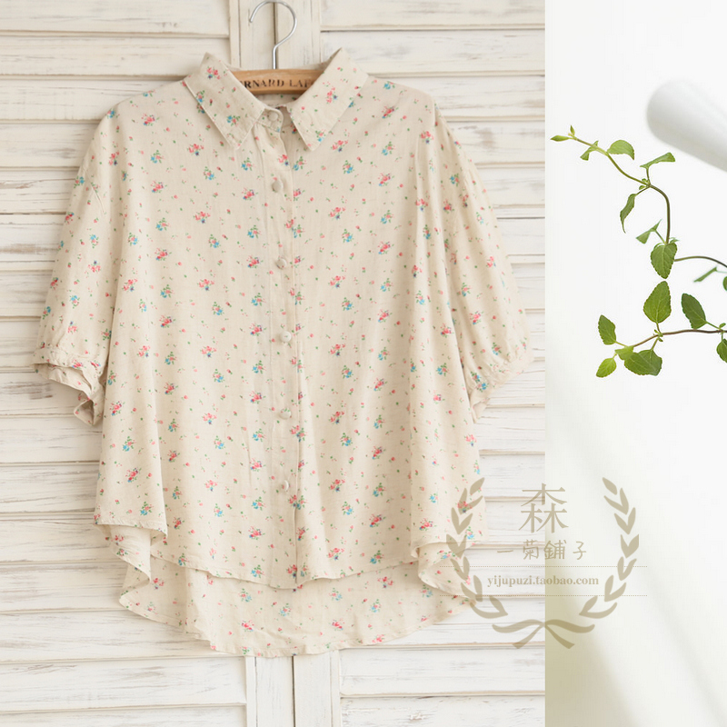 碎花轩,森林系森女蝙蝠袖碎花棉麻衬衫cz