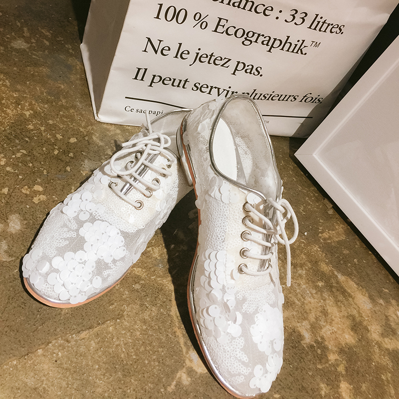 openlady 镂空鱼鳞亮片银边小白鞋