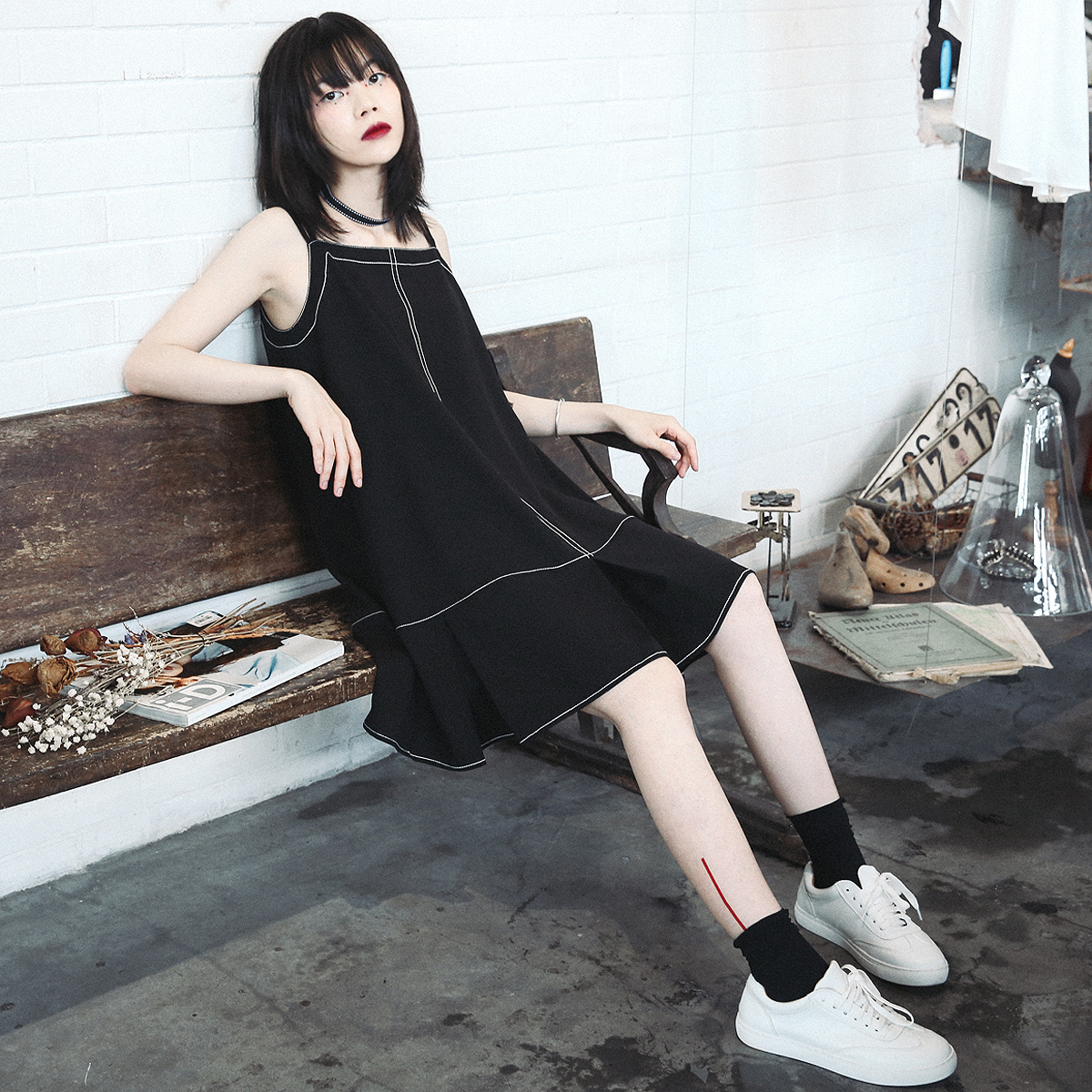 芍药居原创 黑粉小可爱 黑色裸粉色装饰线日系宽松显瘦17夏连衣裙