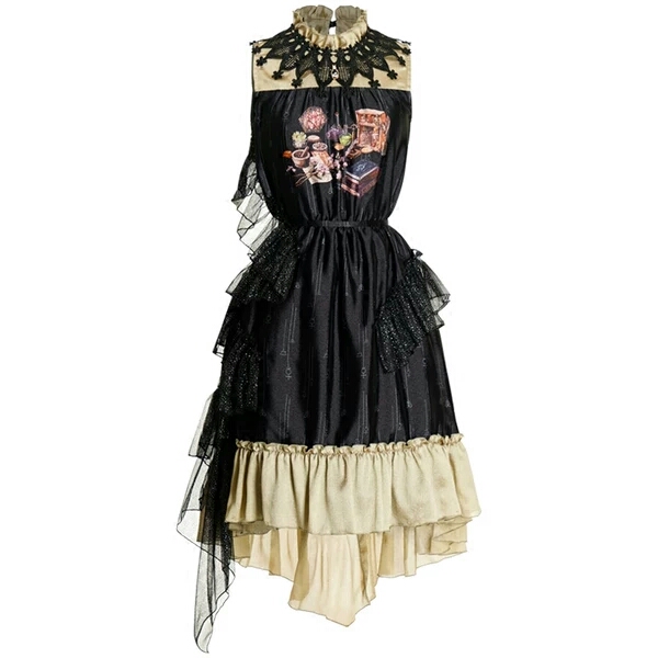 路德2017夏原创印花无袖连衣裙中长蕾丝蓬蓬裙荷叶边燕尾拼接黑色