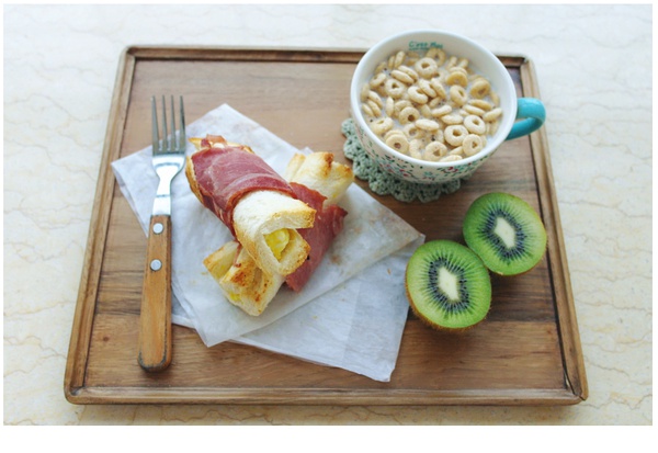 爱心早餐:培根吐司蛋卷,牛奶麦圈圈,猕猴桃