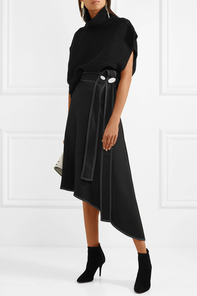 Loro Piana 这款半身裙低调而精致,可谓有着不过时的经典魅力。它采用亚麻、羊毛和真丝混纺面料制成,带有天然的纹理质感。褶裥与腰间系带穿着效果。