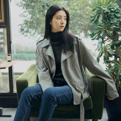 德州巴黎秋冬街头帅气拉链薄荷绿皮衣外套机车服配腰带