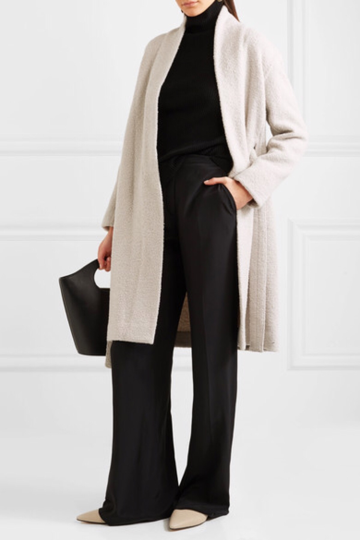 当天气渐凉却还不需要厚重外套时,一件奢华舒适的外套便成了理想之选。Vince 这款单品选用柔软的羊毛混纺大毛圈布制成,呈现品牌特有的 “Chalet” 淡雾灰色调。剪裁宽松的衣身长度及膝,并配有可卸式腰带收束腰肢。