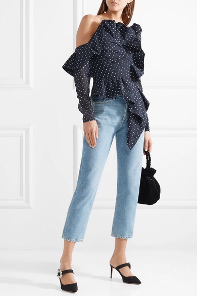 Self-Portrait 这款上衣在 2018 春夏秀台上与飘逸半身裙的组合尤为俏丽迷人,时尚博主 Aimee Song 最近以牛仔短裤搭配出的造型亦同样清新前卫。为向传奇偶像 Bianca Jagger 于 1980 年代的穿衣风格致敬,它采用圆点提花雪纺绸裁就优雅的单肩廓形,衣身和不对称下摆均缀有灵动的荷叶边饰。内置胶骨设计则确保穿着立挺有型。