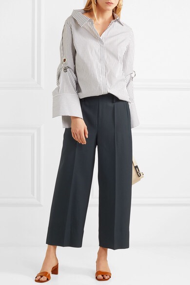 FRAME 翻新经典 “Le Slim Palazzo” 牛仔裤,在高腰正面加添贴袋,令其散发复古韵味。它采用条纹丹宁布制成,面料含有再生棉和少许弹力成分,阔腿裤型舒适有型。