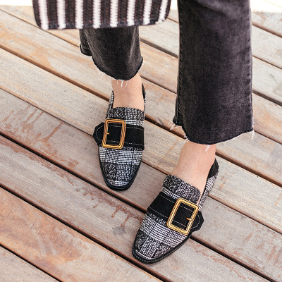 妙侣平底鞋女2018年春季新款复古格子粗跟单鞋女方头两穿懒人鞋女