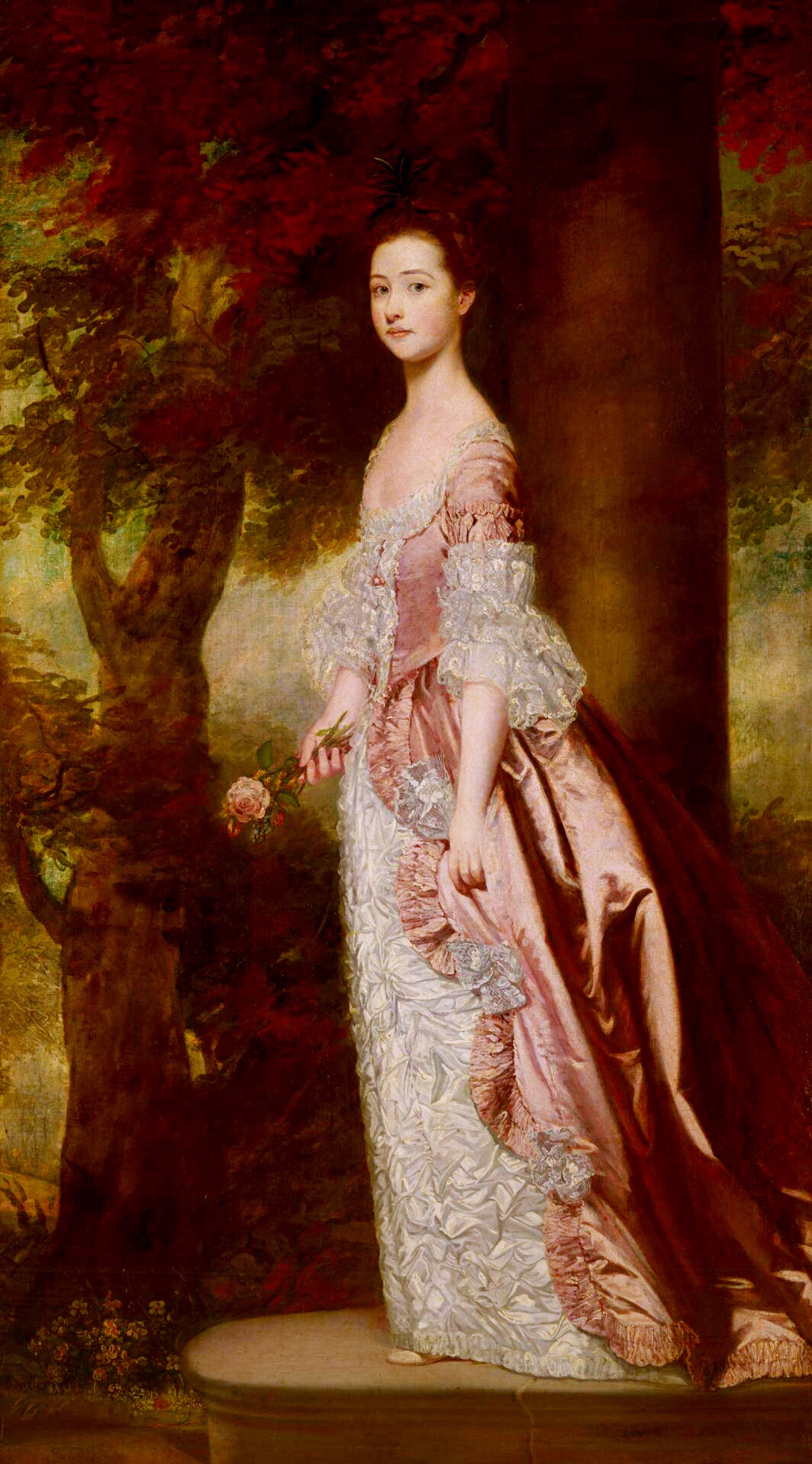 画中人是牙买加蔗糖场大亨家的女儿,被送回伦敦来学习贵族礼仪。雷诺兹画这幅肖像时,她14岁。一身昂贵又清雅的淡粉丝绸裙,像是她的脸颊,也像是她手里的玫瑰花。